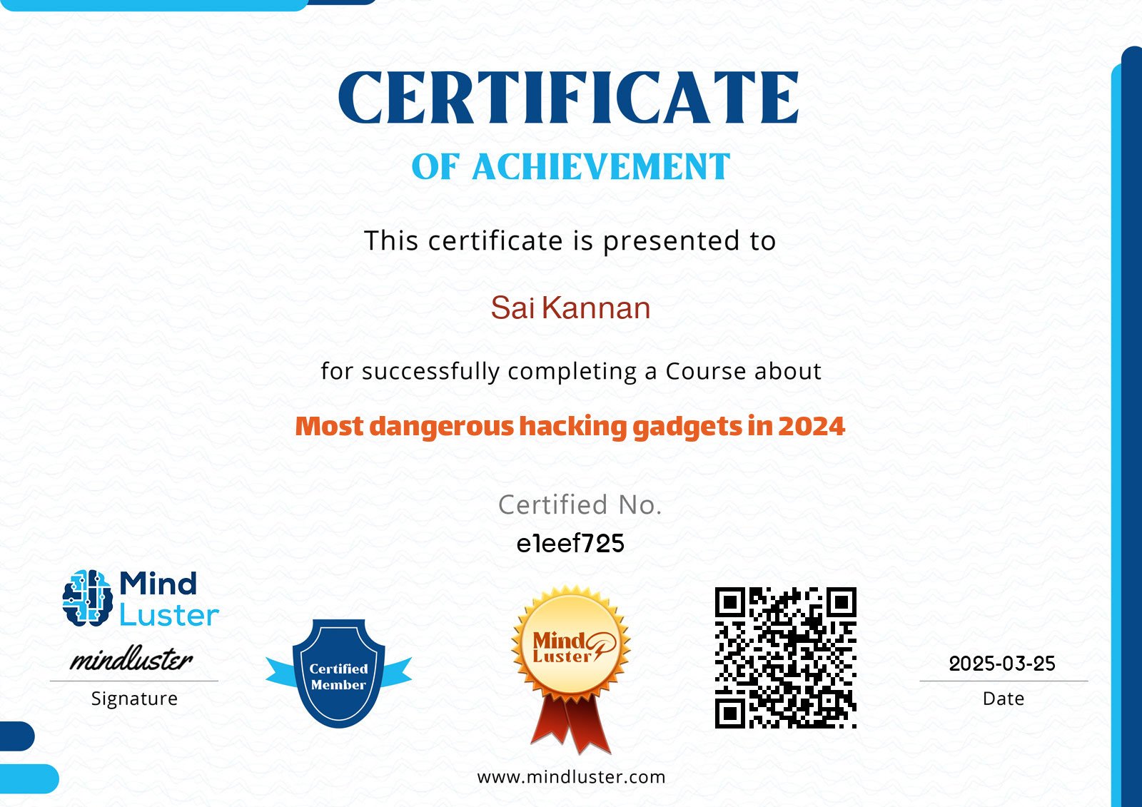 Certificate ID: e1eef725 | Granted: 2025-03-25